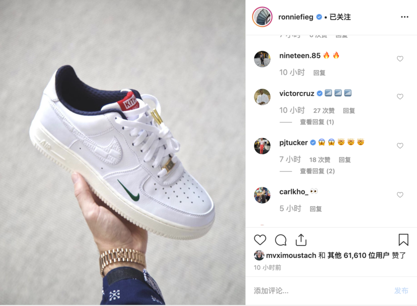 KITH 主理人 Ronnie Fieg 率先为我们亮相了预览图。双方联名以白色皮革主打,鞋舌醒目的红色 KITH ,鞋侧绿色 mini swoosh 以及金色鞋带头、鞋带扣,彰显经典简约风格。