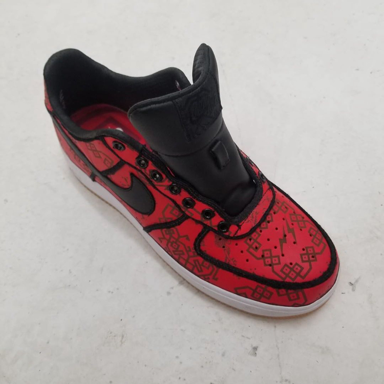 可以看到撕开后的鞋面以红色为主打,精致的 CLOT 标志性镭射图案,国风气质十足。而醒目的闪电 logo 出现在鞋头,彰显出这双鞋与众不同的联名身份。