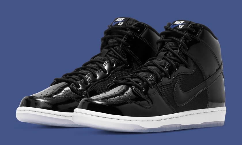 SB Dunk 高帮鞋身采用黑色漆皮打造,搭配白色中底和水晶外底,呈现熟悉的大灌篮气质。鞋舌和鞋侧编织材质,后跟拉环处“SB”字样,则致敬大灌篮细节,还原度极高。
