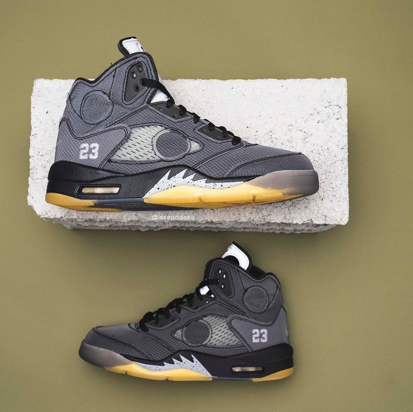 本次 Off-White x Air Jordan 5 依然极具“the ten”风格,烟灰色蝉翼鞋面搭配黑色中底以及黄色半透明大底,潮流感爆棚。反光鞋舌,圆形元素,“23”号字样以及泼墨鲨鱼齿花纹等细节,带来熟悉的 OW 风格。