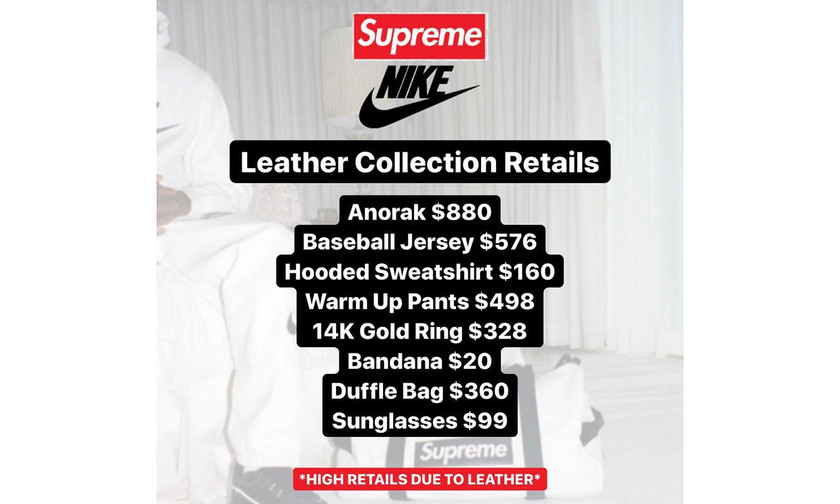 这两天 Supreme x Nike 联名系列吸引了不少潮流爱好者的关注,复古的风格,超奢华皮质的加持,让大家对这一系列心动不已。而此番,Supreme 知名情报账号 @dropsbyjay 为我们曝光了这次系列的官方售价,高昂的价格“劝退”了不少小伙伴。