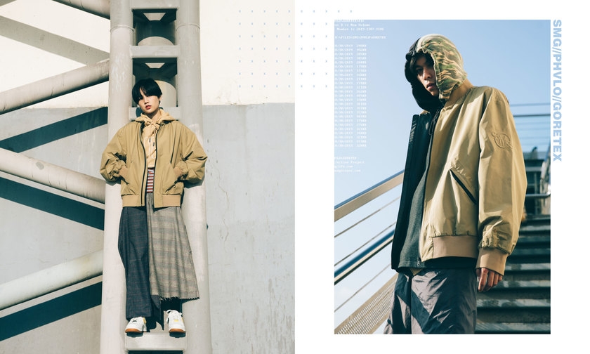 系列包括卡其色和藏青色色调,以 SMG 擅长的军装飞行外套为基础,以多功能性和可持续性作为设计重点,带来了多件式服装结构单品。