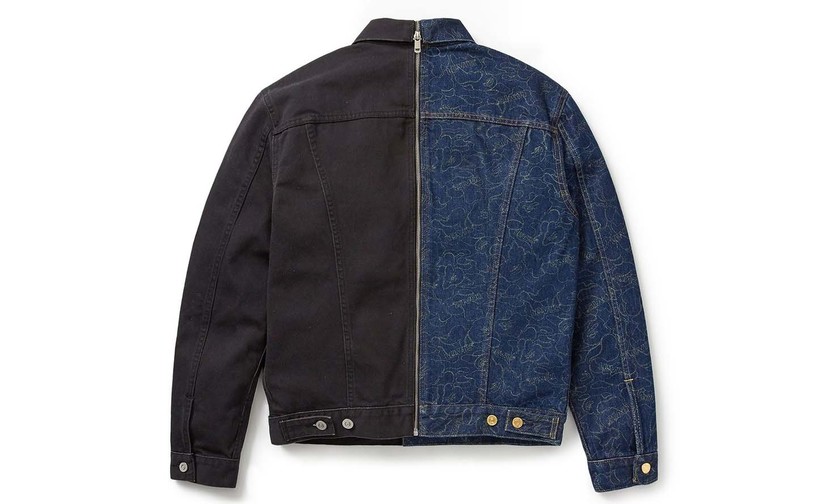 重点单品当然是夹克了,这次双方的设计简直让人拍案叫绝。夹克共有一黑一蓝两款配色,前钮扣后拉链的设计,让夹克可以一分为二,能够将两件不同的夹克融合成一件黑蓝拼接夹克。同时融入 BAPE 标志性的迷彩图案,带来独特的街头潮流气息。