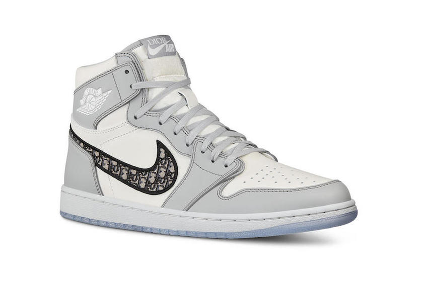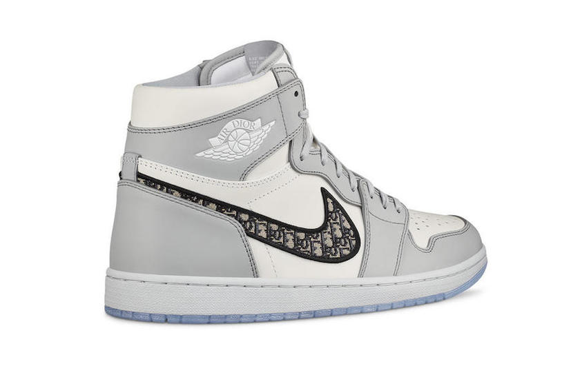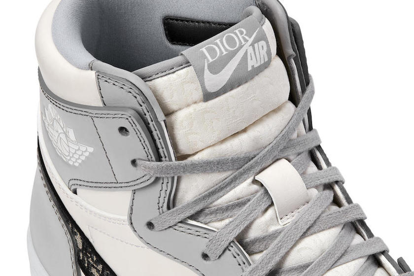 本次 Dior x Air Jordan 1 联名由 Dior 男装设计总监 Kim Jones 参与设计,配色上使用经典白色与 Dior 灰拼接呈现。