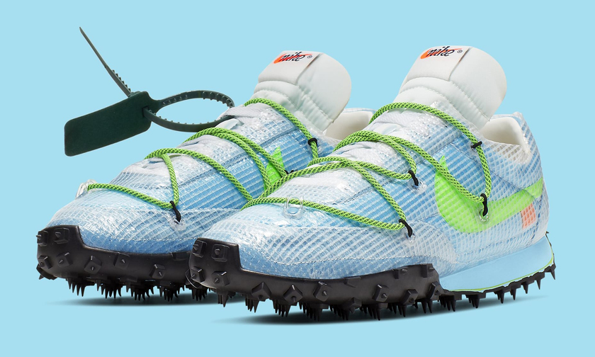 包括乳白、浅蓝、灰黑色 3 款配色,半透明材质制成的双色鞋面,搭配夸张的鞋带系统,穿过鞋带的绿色防伪标,以及其他 Virgil Abloh 标志性解构设计,潮流感爆棚。而夸张的 Waffle 外底则让鞋款拥有更专业的性能。