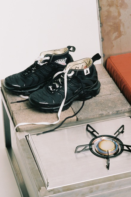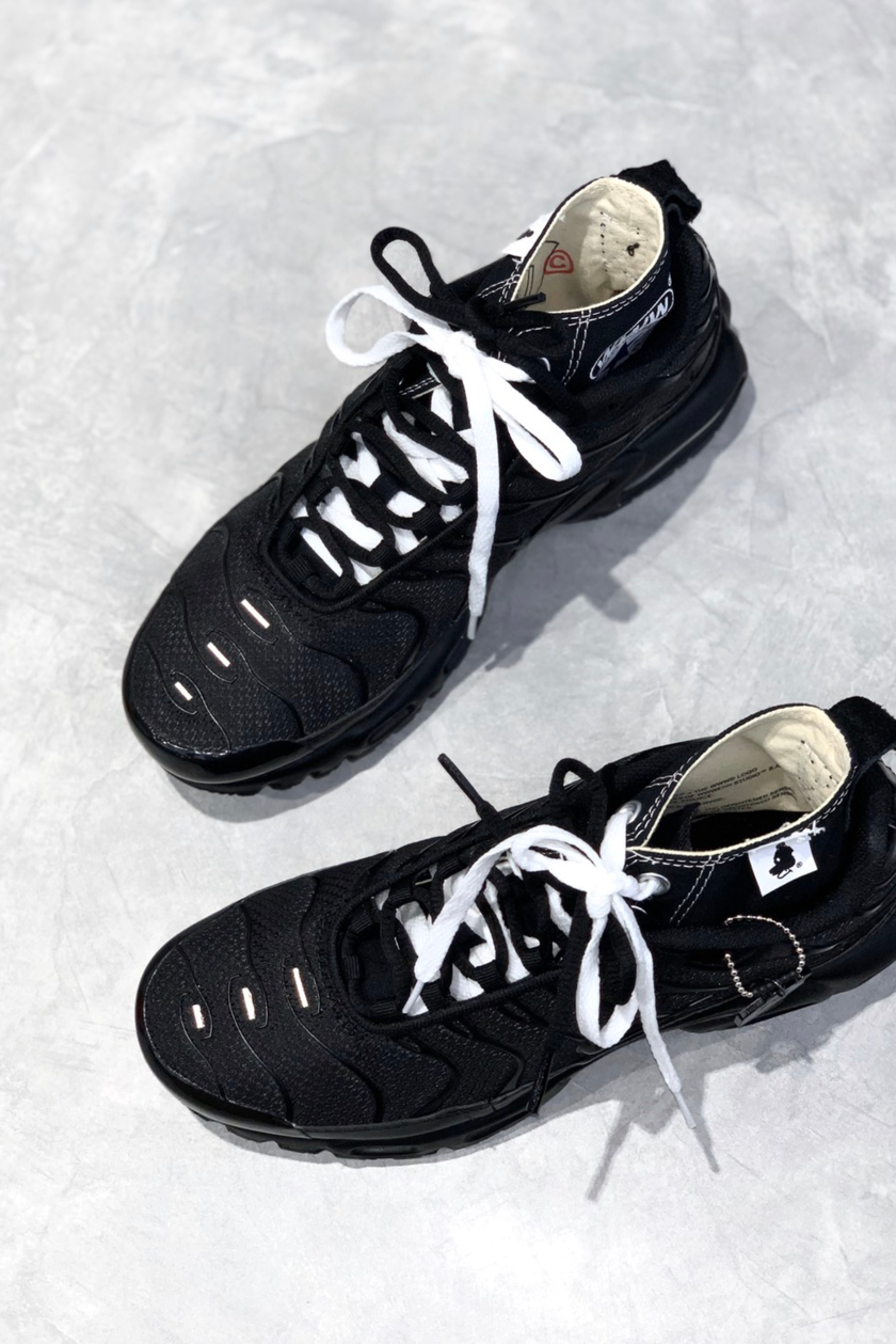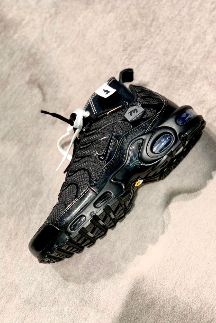 Chuck Taylor 鞋面作为“内靴”出现在了 Nike Air Max Plus 内部,全黑色贯穿的整体,搭配 WWWESH STUDIO 和 HEIGHTENEDSENSE 的标识,低调冷酷又吸睛。