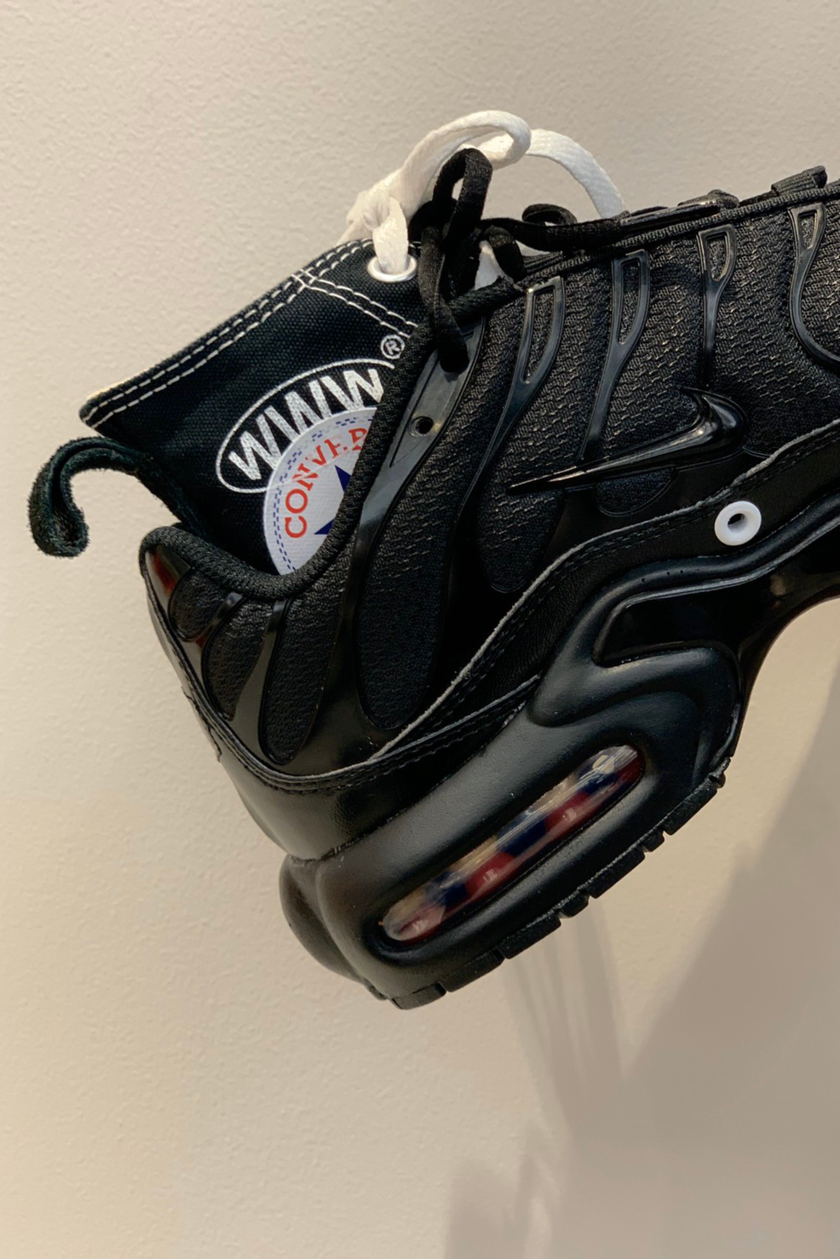 最近,巴黎创意工作室 WWWESH STUDIO 和洛杉矶手工品牌 HEIGHTENEDSENSE 共同打造了一款联名混血鞋款。这款鞋由Nike Air Max Plus 和 Converse Chuck Taylor 拼接而成。