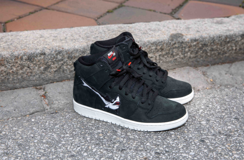 鞋款采用黑色皮革搭载白色鞋底塑造,最为醒目的是鞋侧奶凶奶凶的大白鲨 Swoosh ,这个 Oski 最喜欢的动物堪称整双鞋的点睛之笔,为整个设计注入了灵魂。