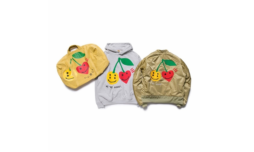系列融合了CPFM 颇具辨识度的黄色笑脸,以及 HUMAN MADE 标志性的红心 logo ,带来了缎面空军夹克外套、连帽卫衣以及手提袋、马克杯等单品。