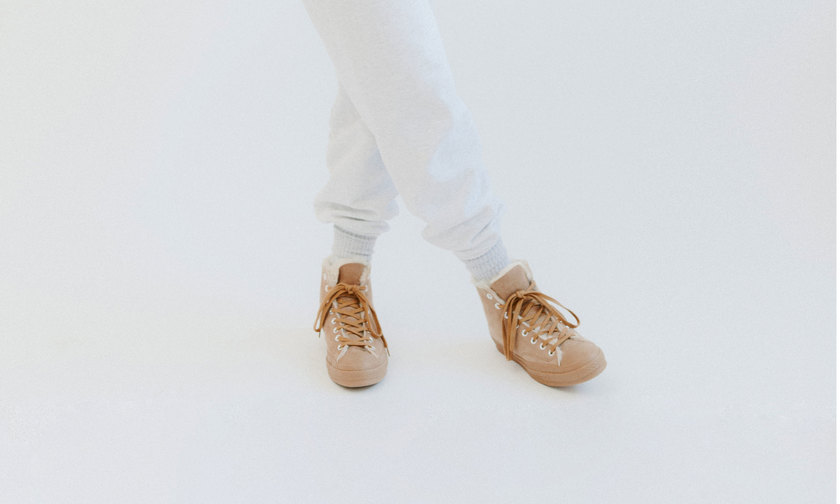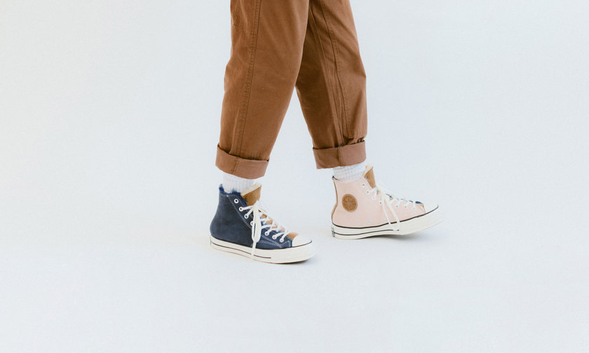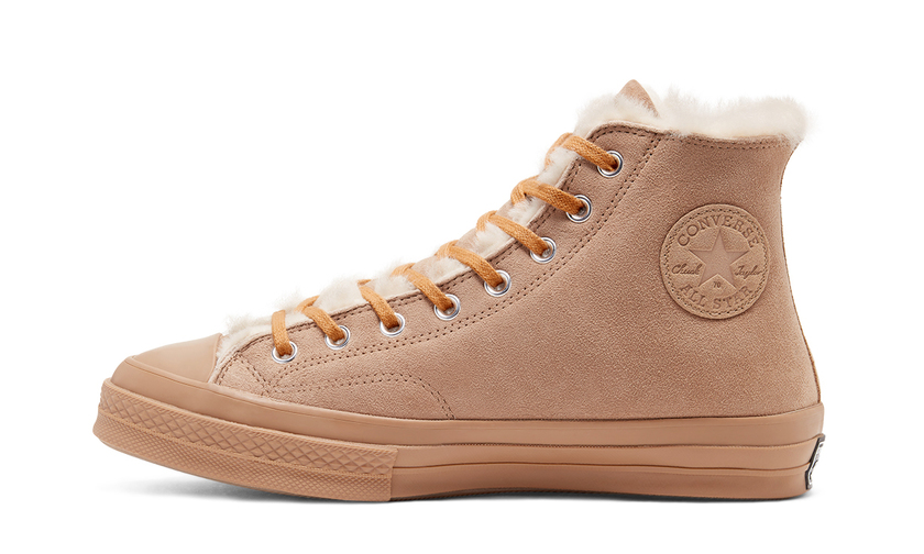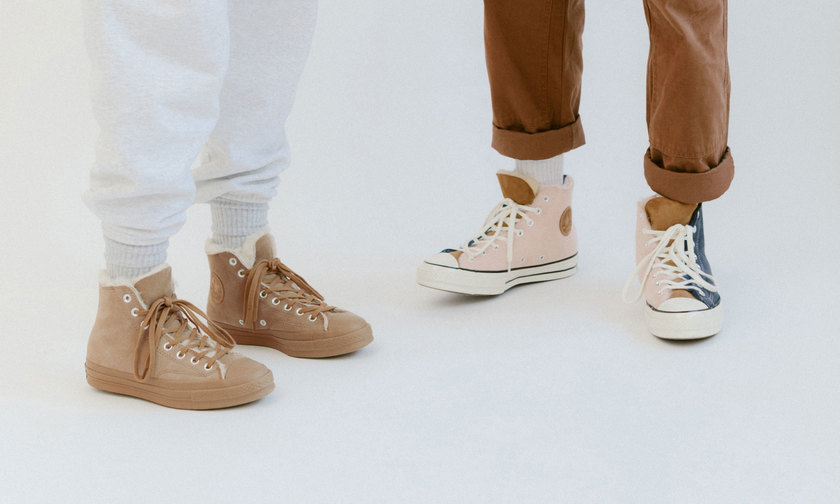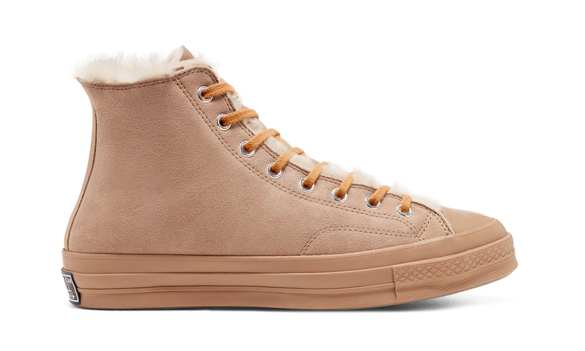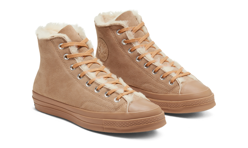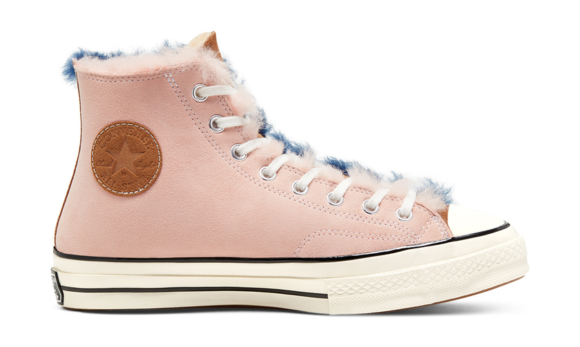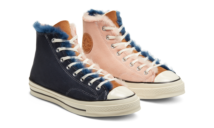 Converse Chuck 70 Shearling 系列共有两款配色,一款为纯卡其色调,另一款为黑粉拼接配色。反毛皮革、厚实羊毛内衬以及 Ortholite 鞋垫的加持,让整个系列不仅潮流感十足,上脚也温暖舒适。