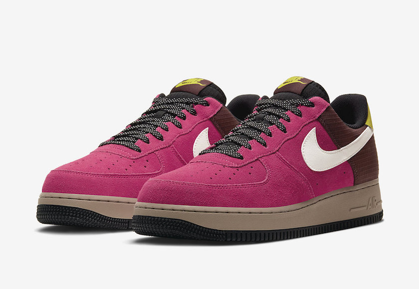 这款配色以玫红色和棕色拼接而成,皮革、麂皮、防水布样式的格纹材质的塑造,接近户外风格。