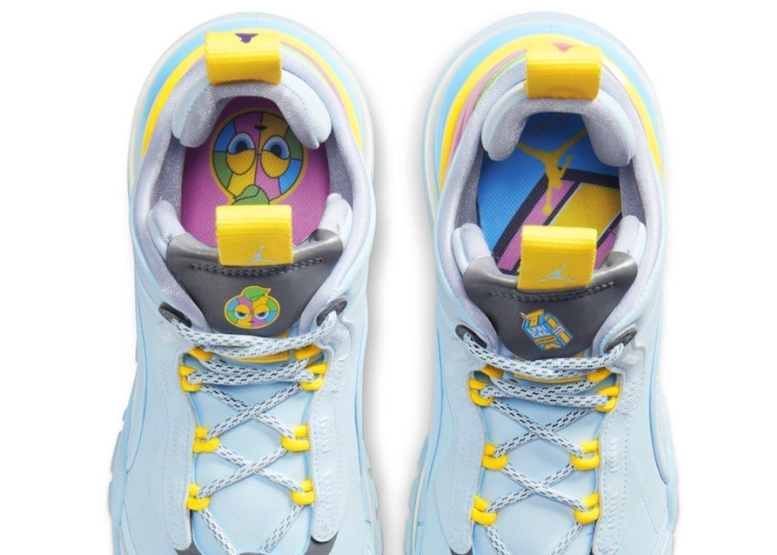 整双鞋淡蓝色调皮革搭配部分黄色、粉色以及绿色的点缀,清新讨喜颜值又高。鞋舌上 Lyrical Lemonade Logo 与卡通人物造型图案则直击本次主题,搭配印花元素丰富的鞋垫,以及水晶外底与气垫,设计可谓相当走心。
