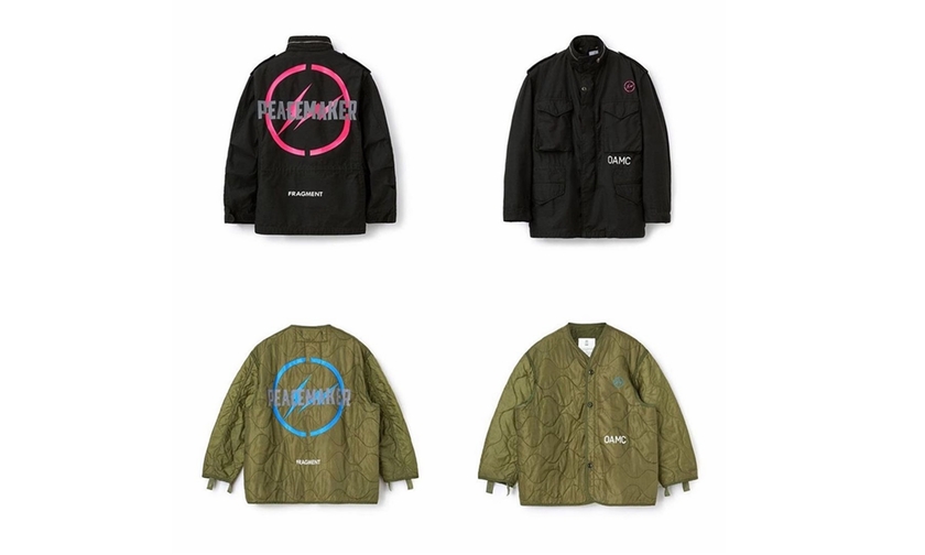 军绿/橙、黑/粉以及白/蓝等色调渲染,搭配大面积 fragment design 双闪电 logo 以及具有 3M 反光效果的 OAMC 代表性“PEACEMAKER”印花,辨识度极强。