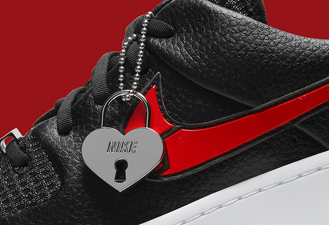 这款配色采用黑色荔枝皮主打,细腻泛有光泽的纹理奢华感极强,搭配红色 Swoosh Logo ,外观表现极其讨喜。而心形小锁的加持,则凸显了特殊的情人节主题。