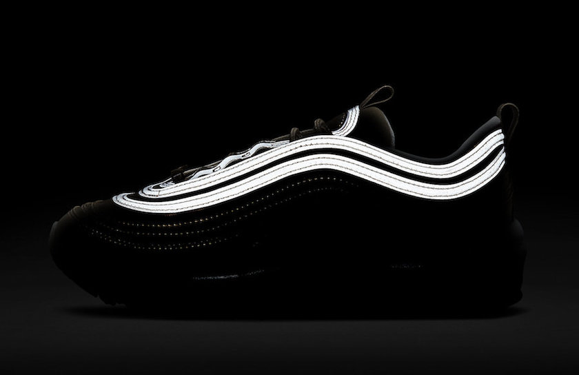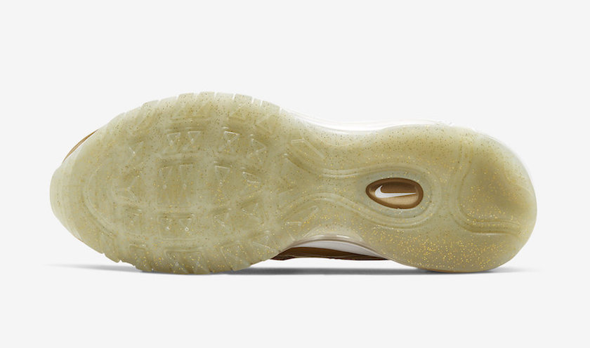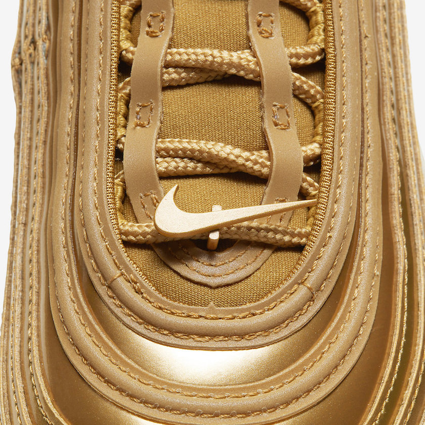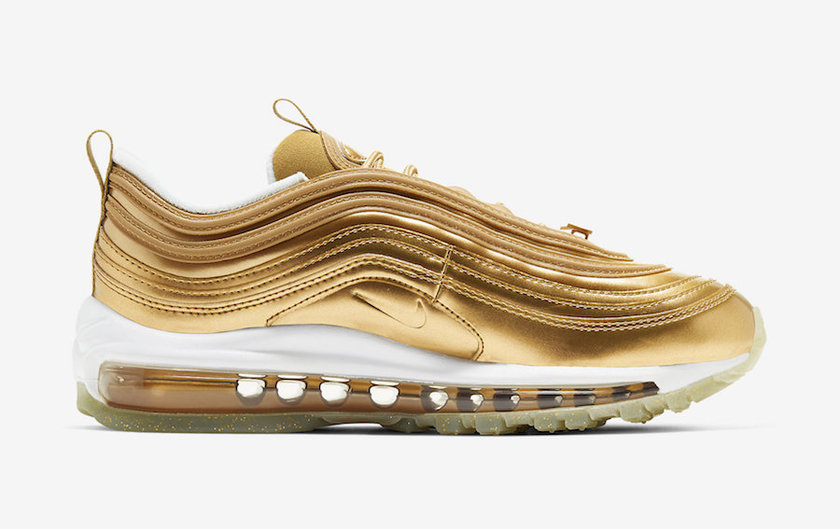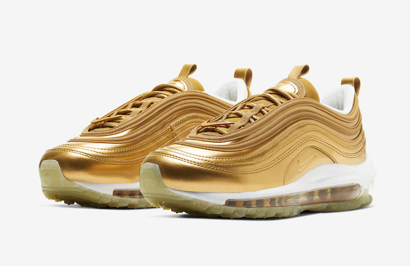 这款 Air Max 97 “Metallic Gold” 整体以金色渲染,富有金属光泽的外观饰以 3 M 反光加持的波浪纹,奢华感与吸睛度爆棚。此外,这款配色细节也可圈可点,鞋头金色 Swoosh Logo 别出心裁,注入金粉细节的半透明外底也质感出众。