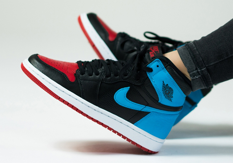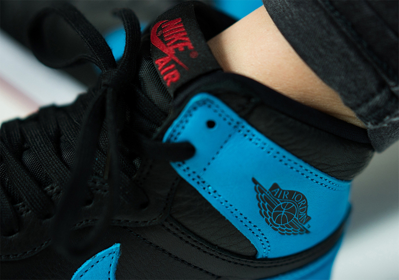 皮质版本整体与漆皮版本相似,采用芝加哥与北卡蓝两款配色拼接而成。不同之处在于皮质版本鞋身中部以黑色装扮呈现,穿搭上更易搭配更显酷帅也更耐脏。