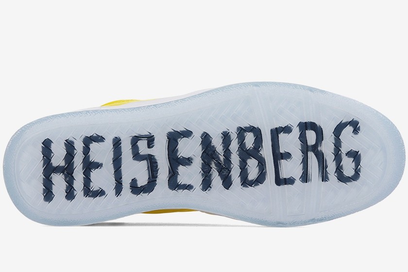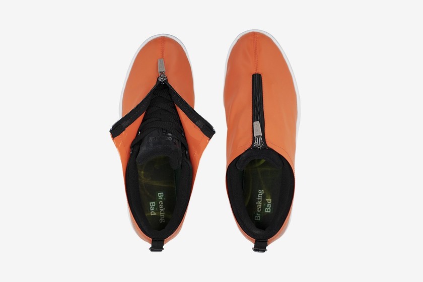 其中分别以黄色和橙色主打的两双配色灵感来源于《绝命毒师》剧中制毒时大白 Walter White 和小粉 Jesse Pinkman 穿着的防化制服,双层鞋面设计搭配拉链设计,鞋底点缀的剧中主角绰号 “HEISENBERG” ,辨识度极强。