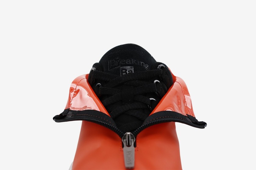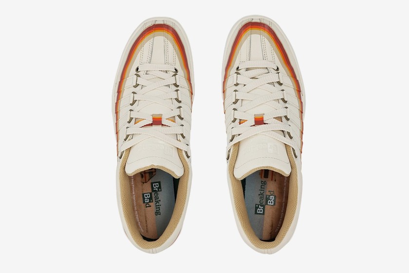 而第三双乳白色主打,搭配橘红渐变条纹点缀的联名,则是以剧中第一次制毒的房车为灵感,鞋垫上的剧照以及印有《绝命毒师》剧名 Logo 的鞋盒,直击本次主题。
