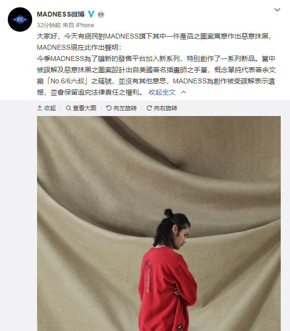 今日,MADNESS 官方微博晒出了品牌全新系列单品预览,没想到其中的一件卫衣印花引起了争议,直接将余文乐送上了热搜。