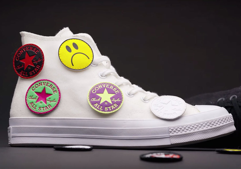 这款联名鞋身以白色主打,不同颜色的 Converse 五星标以及难过小黄脸 DIY 魔术贴的注入,创意十足,赋予鞋款极强的趣味性和可玩性。