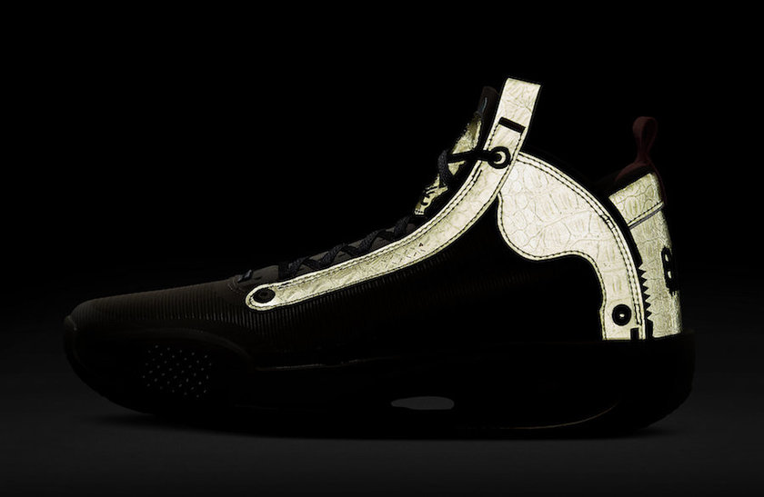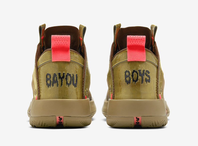 鞋款灵感来源于亚利桑那州河口的鳄鱼,鞋身色调与鹈鹕队的金色呼应,从鞋头延伸到后跟的鳄鱼元素相当狂野。搭配以极具恐怖气息的设计手法呈现的鞋头锯齿状标签以及后跟 BAYOU 字样,吸睛效果极强。