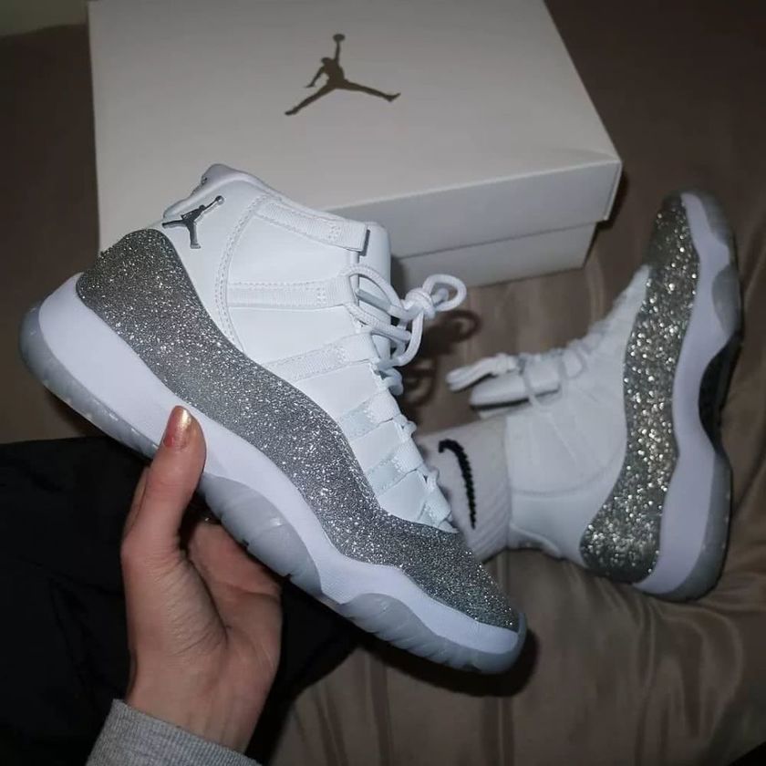 在去年年底发售的AJ11全新满天星配色就也是这么一款比较有代表性的鞋款。AJ11作为历史上最经典篮球鞋、潮鞋,在多数时间里都是以一幅直男鞋款呈现,而满天星配色用了闪闪惹人爱的银色亮片点缀无疑为其展现了女性扮相,本来在国内市场并未掀起太大波澜的AJ11满天星随后更是靠国内电商平台的宣传营销打上了“婚礼鞋”一类的标签成功涨价。