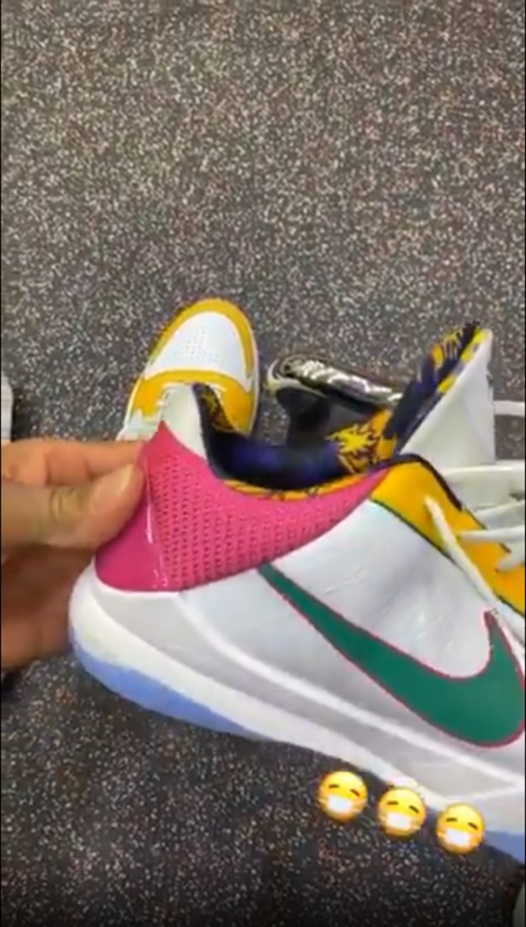 这款 Nike Kobe 5 整体以白色为基调,橙黄色、粉色色块以及绿色 Swoosh 的点缀,使整体视觉效果极其抢眼风骚。