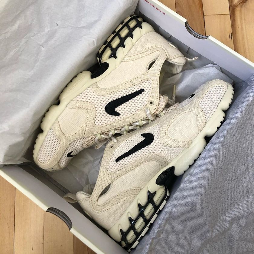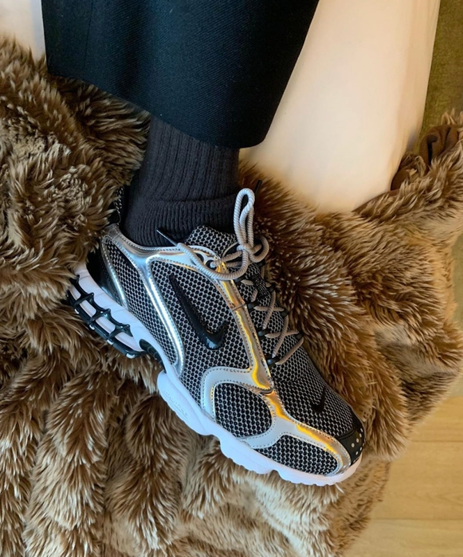 正是美国元老级潮牌 Stussy 与 Nike 的合作款。黑色帽子搭配咖色夹克、米色休闲裤,再搭配一双乳白色 Stussy x Nike Air Zoom Spiridon Caged ,极具街头潮流感,不得不说 Travis Scott 在潮流这块可是把控的死死的。