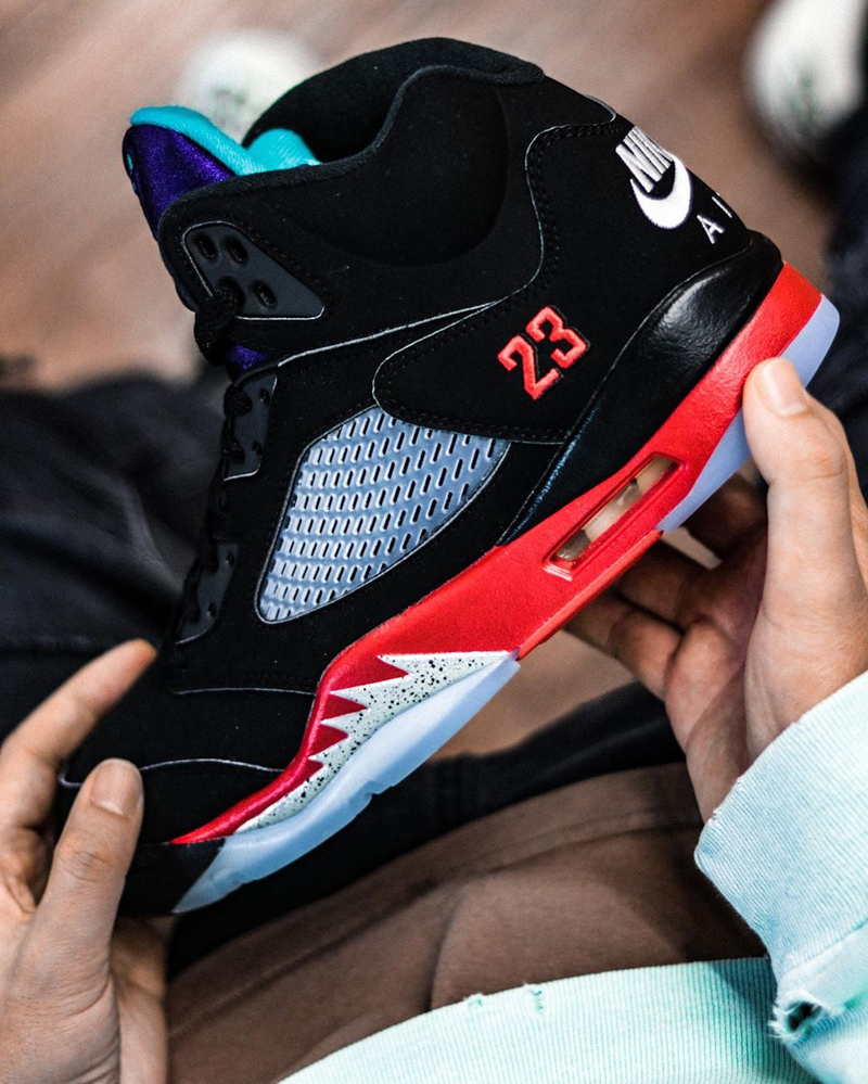 而今年AJ5作为Jordan Brand的主角也尝试了Top 3的设计,但是却做了很好的改变,只把黑色作为主打色无疑非常明智,为鞋款带来高冷百搭气质的同时也能用红蓝两色去做个性点缀,取消色块的不和谐拼接显然是非常机智的选择。
