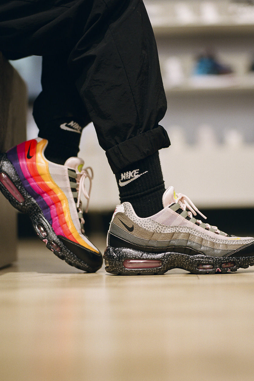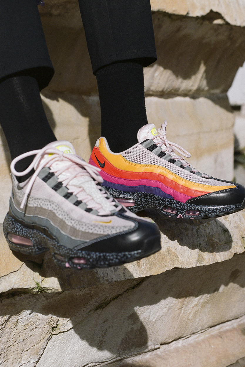 从过往推出过的 20 款 Air Max 经典配色上汲取灵感,该联名将不同的色彩、元素融合到了一起。彩虹般绚烂的鞋面,左右不对称设计以及高级石斑纹理中底,让整双鞋抢眼效果满分。