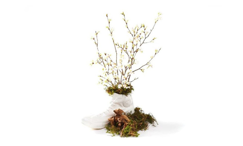 这款花瓶以经典鞋款 CONVERSE All Star Hi 为灵感塑造,由 Ceramic Japan 烧出来了全白的陶器花瓶,加上 .blink 的植物创作,观赏性绝佳。