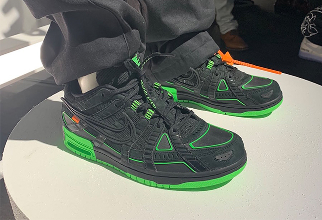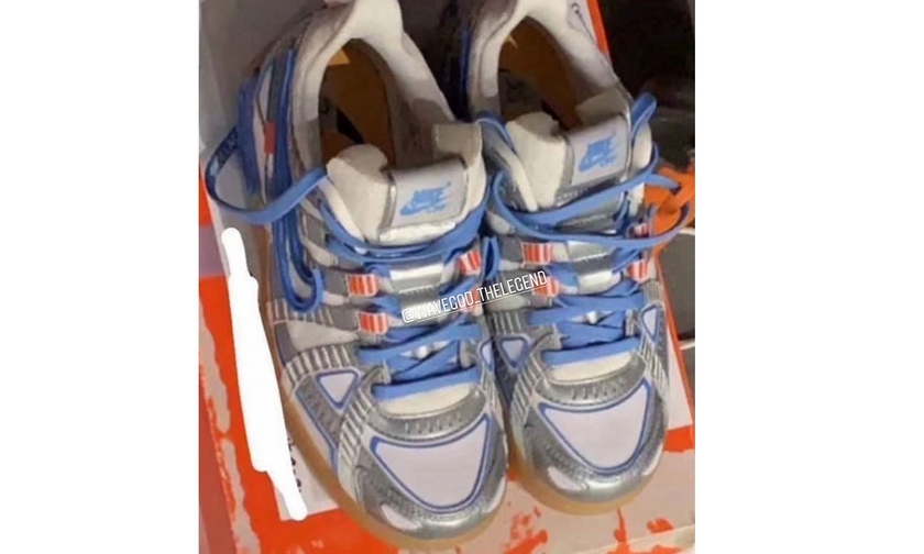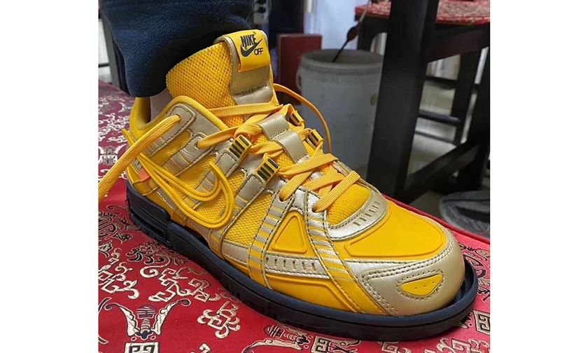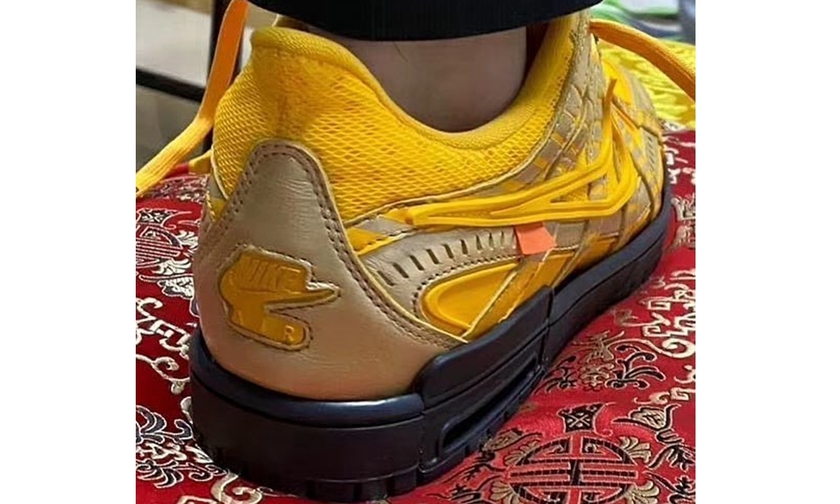 继黑绿、灰蓝配色曝光之后,OW x Nike Air Rubber Dunk 第三款黄银配色也在网上曝光了。