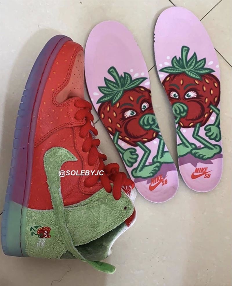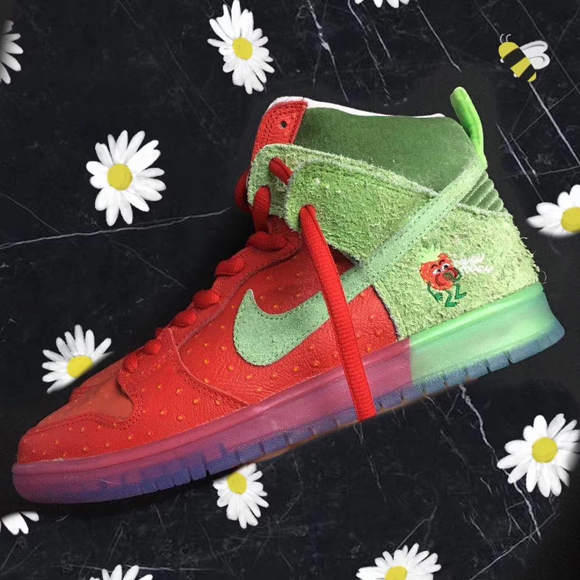 Nike今年在Dunk SB High上的推出十分频繁,近日国外社交媒体就曝出了一款 和艺术家Todd Bratrud合作的全新配色“Strawberry Cough”。鞋身采用了绒面革材质并用抢眼地红绿两色拼接,视觉效果相当酷炫。