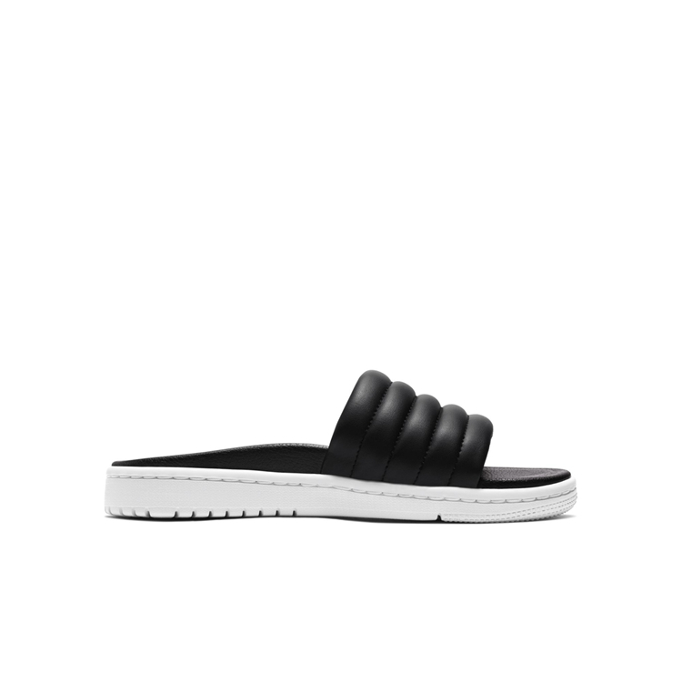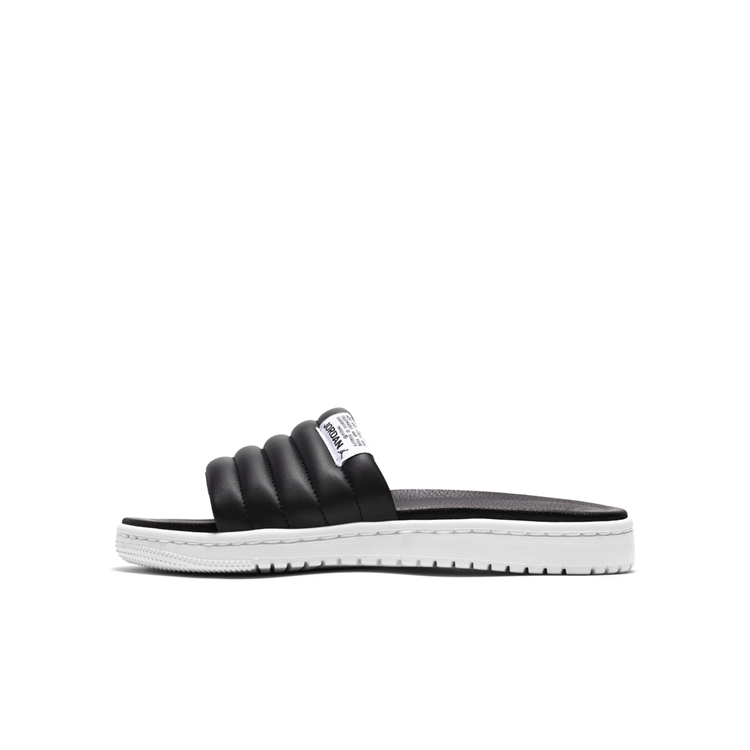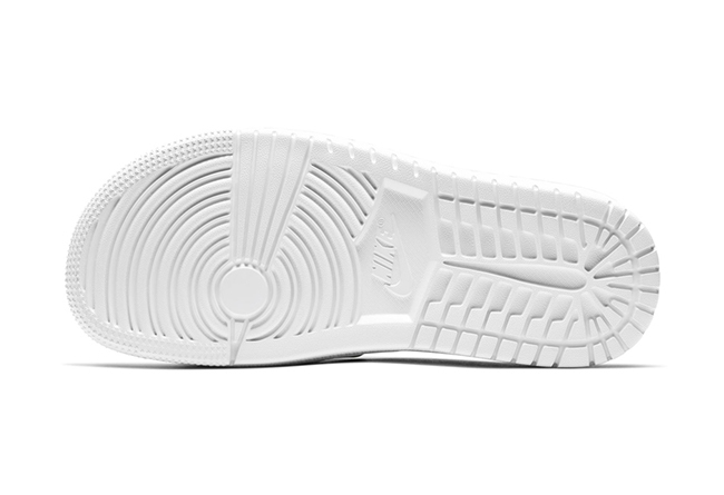 这款全新拖鞋也以条纹状示人,奢华皮革打造,质感相当不俗。而其最大的亮点在于鞋底采用了 Air Jordan 1 鞋底造型设计,光看鞋底,一瞬间会误以为是 AJ 1 ~