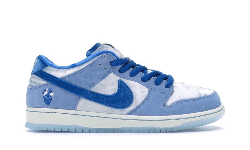 而近日,ins 球鞋情报账号 @ovrnundr.io 则向大家曝光了另一款色版本 Sample 谍照。与粉红色版设计相似,蓝色版也以天鹅绒材质主打。深浅不同的蓝色点缀辅以 StrangeLove 标志性 “Heart Skulls” 骷髅心脏刺绣,吸睛度爆棚。
