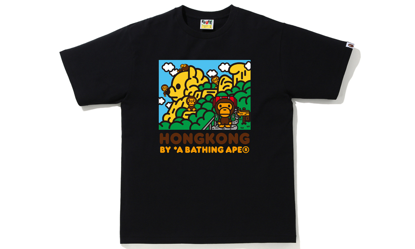 设计以与 BAPE 香港门店有关的紫色,蓝色和黑色迷彩图案主打,品牌标志性元素经典的鲨鱼和猿人头注入,辨识度与街头潮流姿态十足。部分 T恤上还有“HKG”的香港限定 logo ,特殊身份展露无疑。