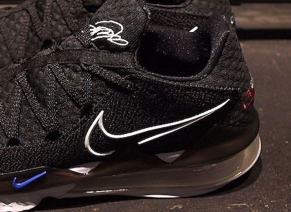 这款新配色名称比较有意思,名为 “LeBron James”。整双鞋采用黑色编织鞋面示人,白色装扮的鞋舌 logo与鞋侧 Swoosh 以及蓝色迷你 Swoosh,缓和了纯黑色沉闷的气氛。