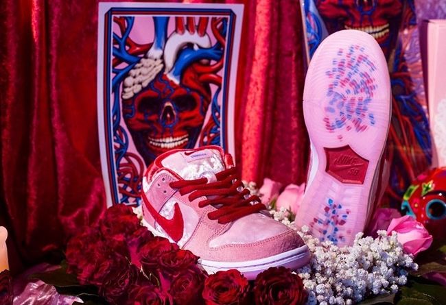 然后让我们把目光转向今年年初的话题作,Dunk SB是今年Nike的主打鞋款,因此联名特别的多。和滑板团队StrangeLove合作带来的情人节联名款则吸引了无数鞋迷的关注。除了鞋款本身使用粉色绒面革材质之外,特别的鞋款更是亮眼。