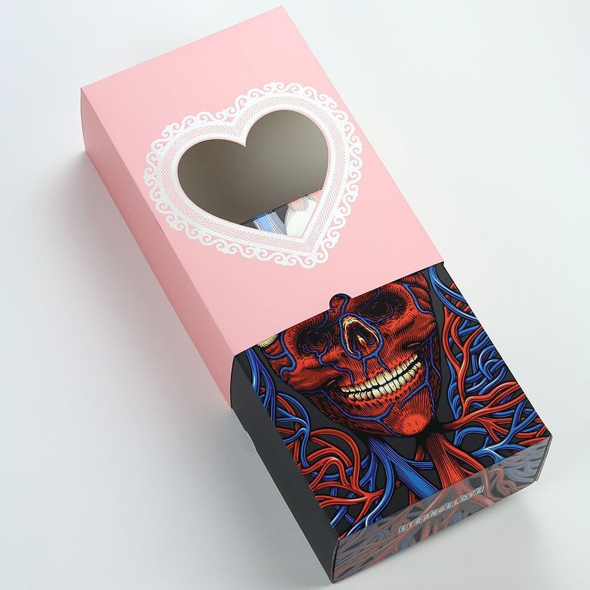 骷髅作为西方文化里一个独特的存在和东方的理解截然不同,以此呈现表达西方情人节的主题也十分合理,鞋盒的设计称得上艺术品哦。