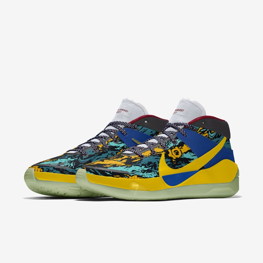 以不俗的性能和丰富的配色俘获众多实战党的杜兰特最新战靴 Nike KD13 近日开启了定制服务。定制项目有 12 项,包括鞋面、中底、Swoosh Logo 下方的中底选色、后跟 ID 等等。