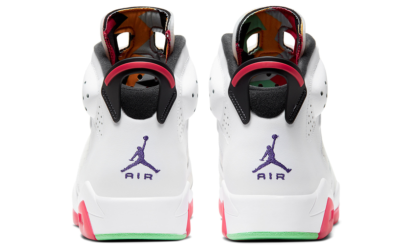 受到经典 AJ 7 “兔八哥”的影响,这款 AJ 6 “兔八哥”不少细节以最原始的 Hare Jordan 风格呈现。比如鞋面灰白设计,红丝绸鞋舌,以及鞋舌内侧、鞋垫、外底部分的多彩几何拼接图案。