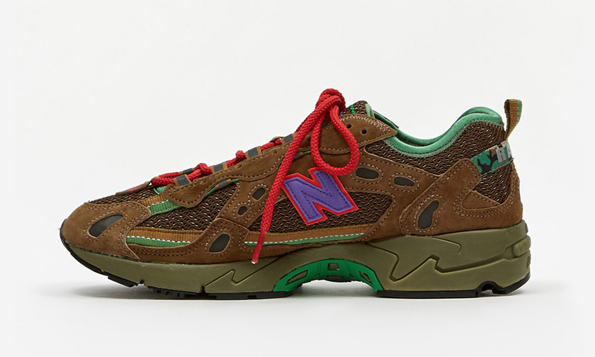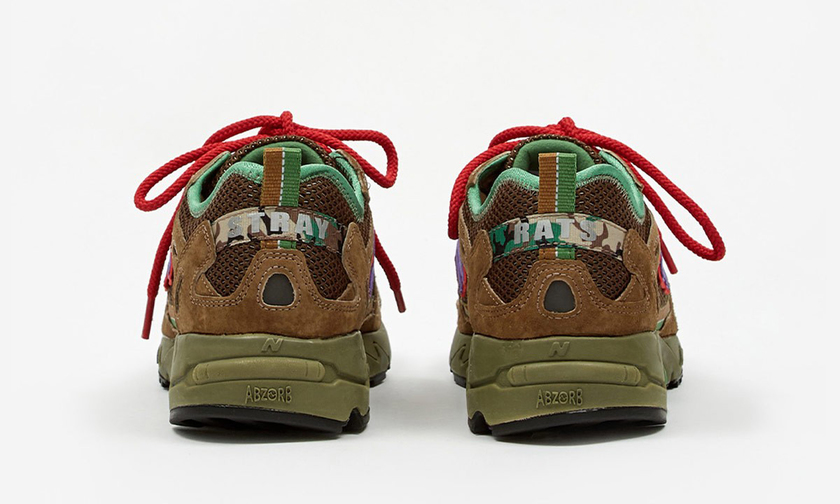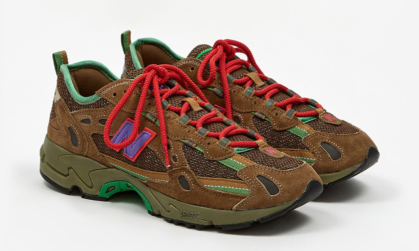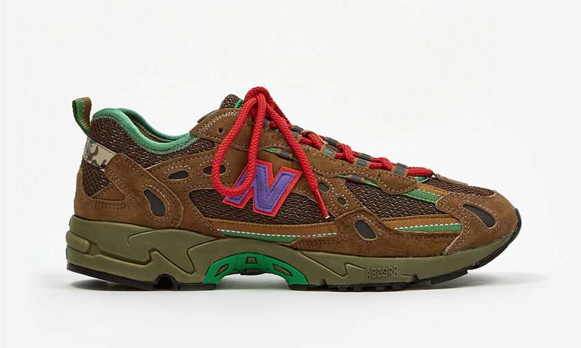 整款设计在深浅棕色的主色调基础下,融入了红、绿、紫等亮色细节,搭配跟处的迷彩拉环及品牌标识,视觉效果抢眼,辨识度极强。