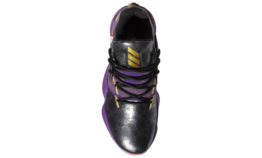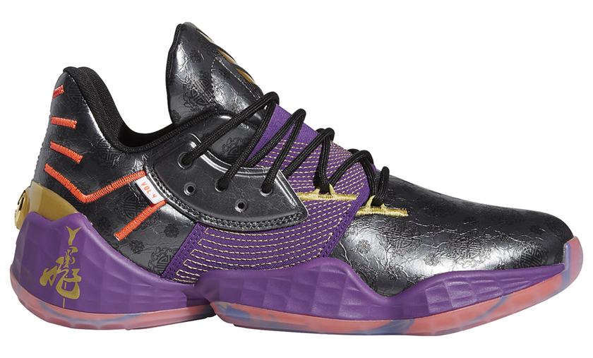 全新 Harden Vol.4 以黑紫色调主打,饰以橙色、金色细节点缀,奢华感强烈。皮质鞋面上中国风印花图案颇有看点,后跟点缀的飛字与兵器丈八蛇矛则直击张飞主题。