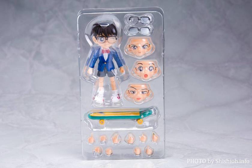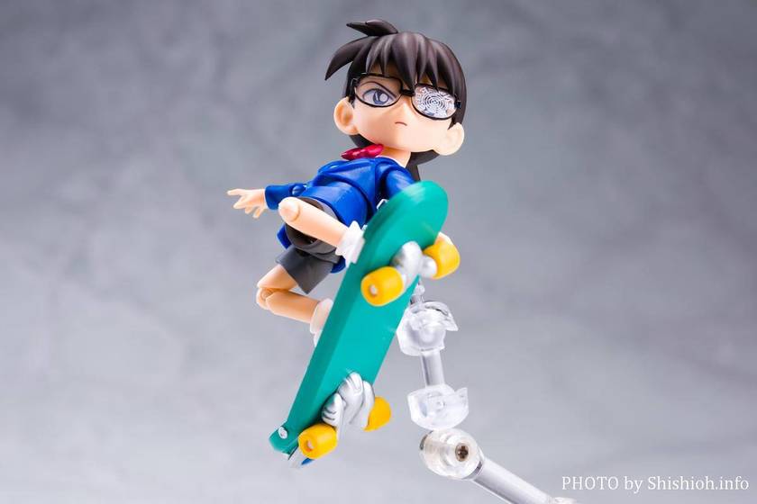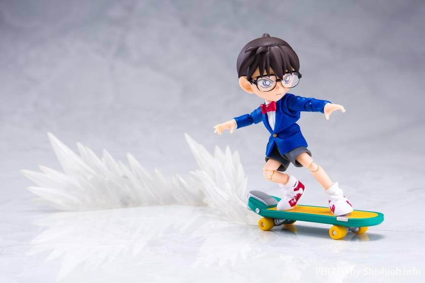 万代厂商在四月曾经推出了全新的《名侦探柯南》S.H.F系列人偶,就选择柯南作为主角,设计方面则主要参考了追踪时的动作造型设计。除了多关节可动设计之外,还附带了多种手势、表情以及经典的滑板等道具。