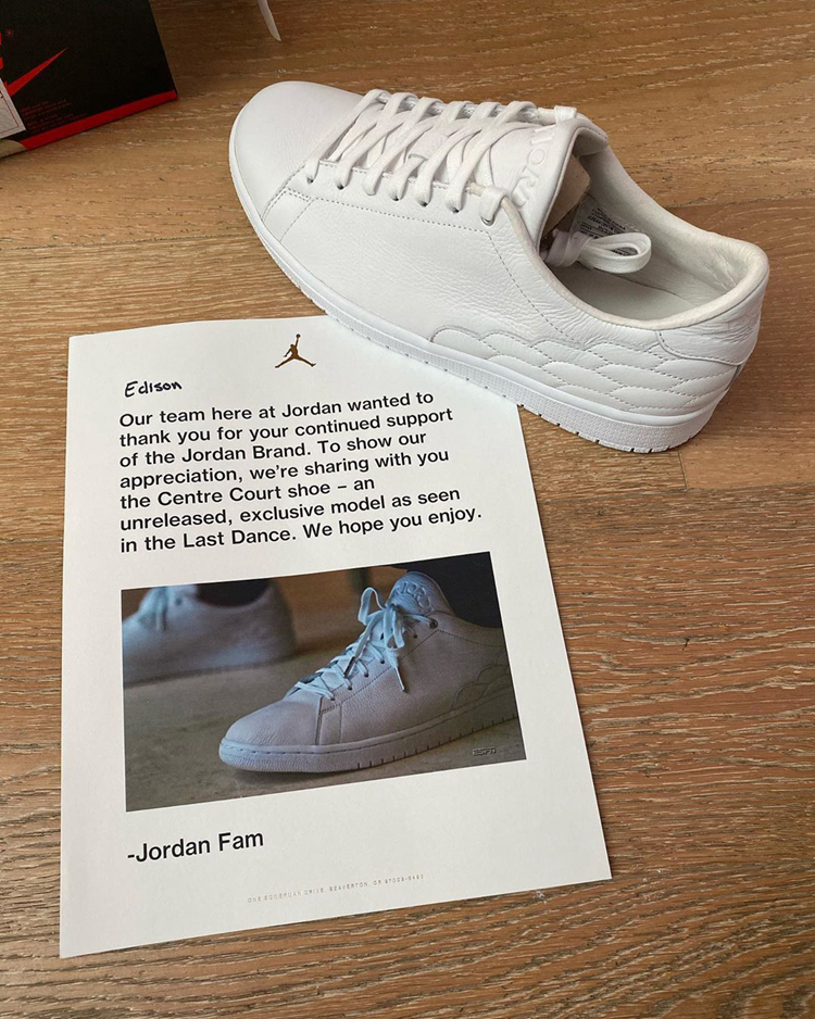 这双 Jordan 新鞋不是一般的小白鞋,它在近期乔丹纪录片《The Last Dance》中出现过,第一集乔丹本人还亲自上脚了。