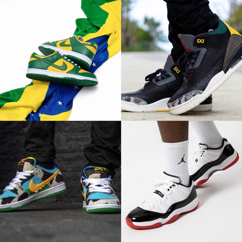 分别是巴西 Dunk Low 、“黑红+康扣” Air Jordan 11 Low、“动物园 2.0”Air Jordan 3 以及牛奶冰淇淋联名 Dunk Low 。