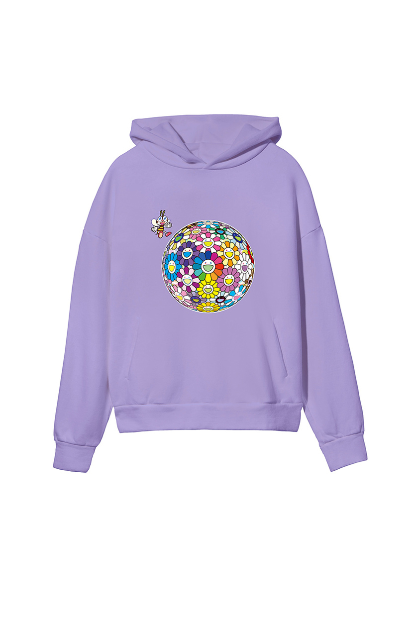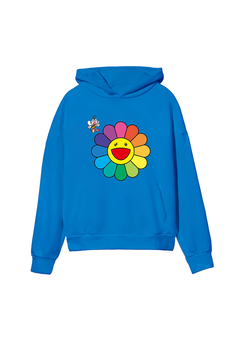 系列包括T恤和连帽衫两款基本单品,钴蓝、灰白、兰花紫和藏红花黄四种明亮配色为基调,点缀村上隆最经典的太阳花图案,元气又醒目。此外,每件单品上还印有特别设计的蜜蜂,与太阳花搭配玩味爆棚。