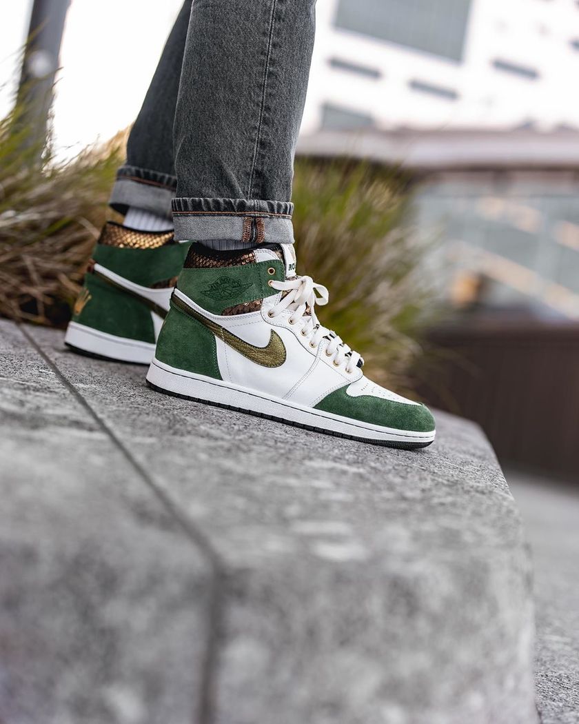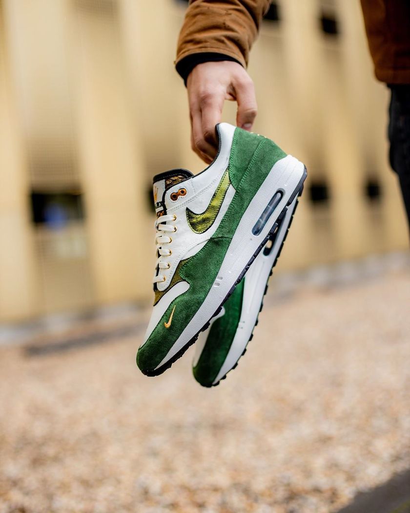 白色皮革搭配绿色麂皮并饰以金属质感暗青色 Swoosh ,颜值极高,质感也极为奢华。鞋帮处暗金色蛇纹细节堪称亮点,为整体带来野性魅力。