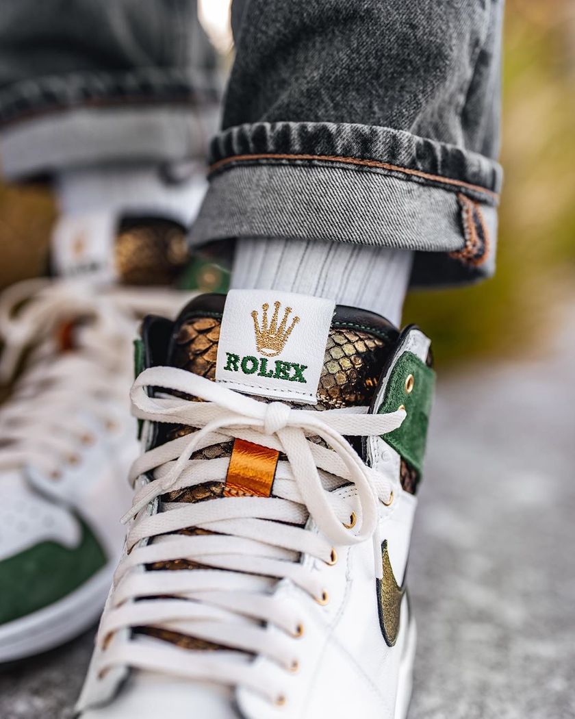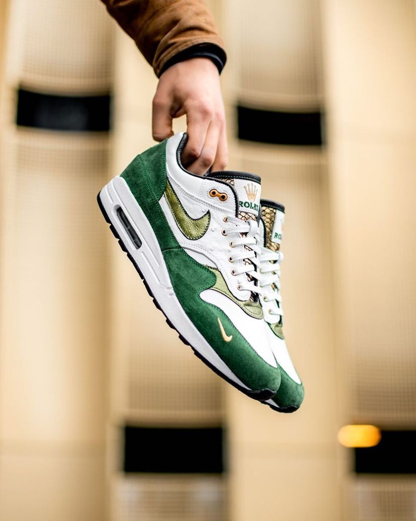 以劳力士腕表为主题,最近来自荷兰的球鞋定制师 @vijzbespokes 带来了一款 Air Jordan 1 和一款 Air Max 1 。两款定制在风格上颇为相似,均以白绿色调主打。