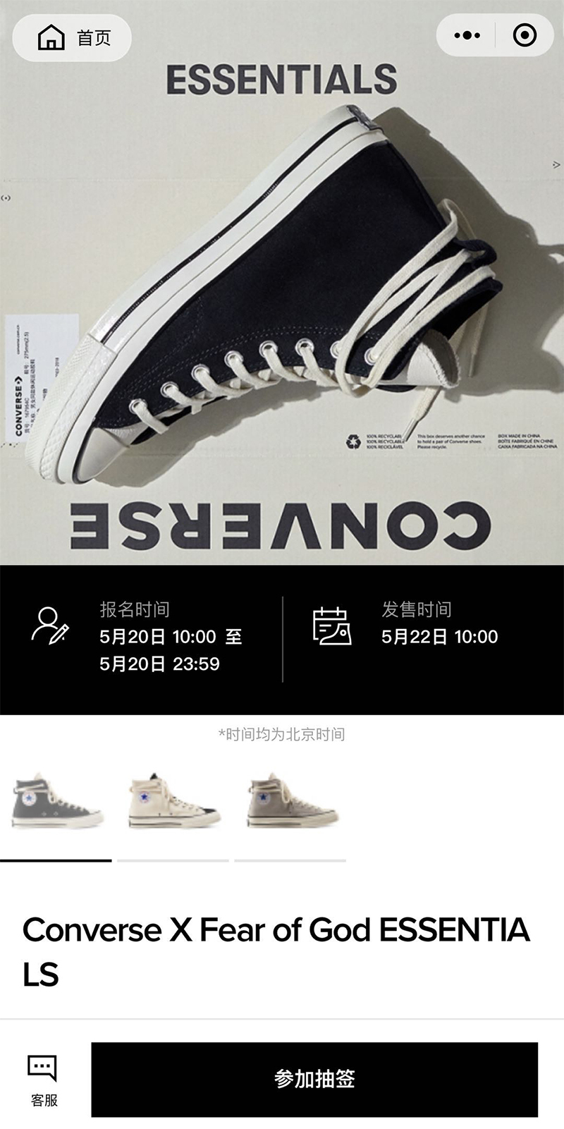 二月在小程序发售直接导致小程序崩溃,随后 3 月在国内各大潮流店铺登场也掀起抢购热潮的 Fear of God Essentials x Converse Chuck 70 ,此番再次登录 Converse 微信小程序,开启抽签发售。